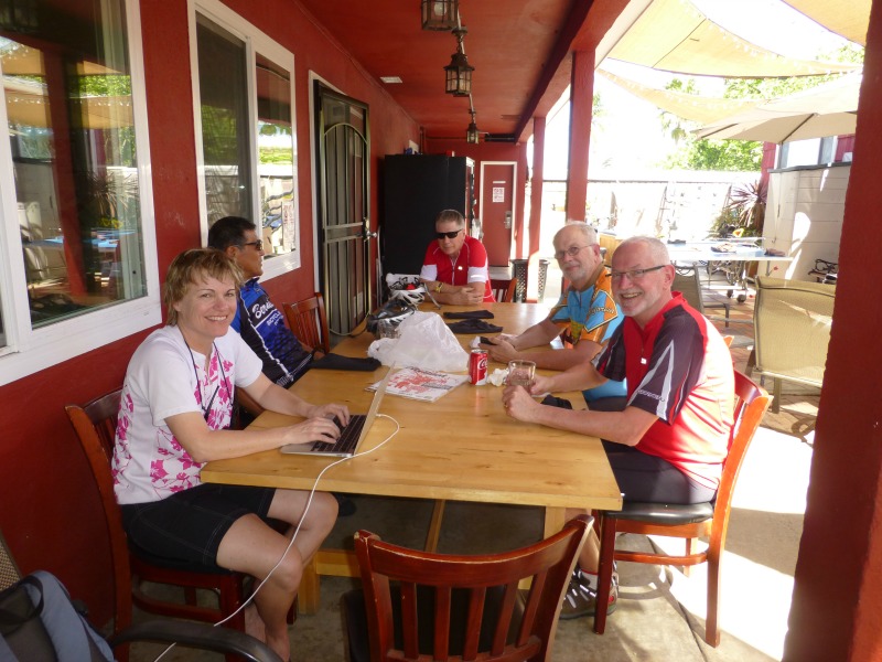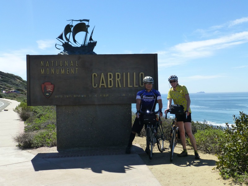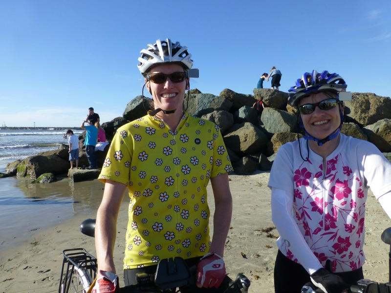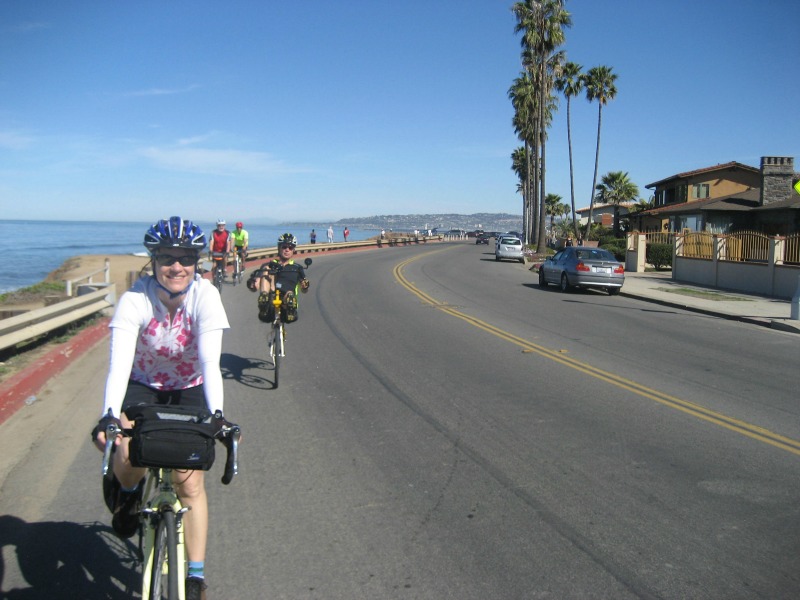 It’s a familiar sight: Carl up ahead, leading us along, slowing to chat, then picking up speed again when the full flock is gathered. The background this time is much different though, having gone from the vast stretches of brown that characterized Death Valley to these vast stretches of oceanic blue. It’s a great day to take the training wheels off and make sure we still remember how to pedal these two-wheeled machines that haven’t touched a bit of asphalt since last October.